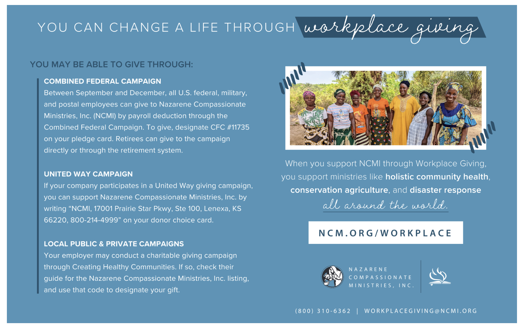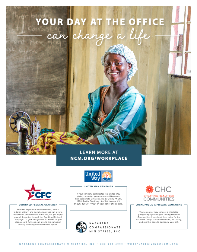 Combined Federal Campaign: Between October 1, 2025, to December 31, 2026, all U.S. federal, military, and postal employees can give to Nazarene Compassionate Ministries, Inc. (NCMI) by payroll deduction through the Combined Federal Campaign. To give, designate CFC #11735 on your pledge card. Retirees can give to the campaign directly or through the retirement system.