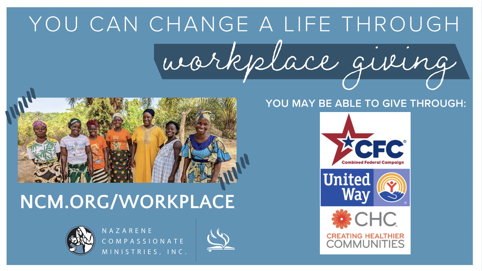 Local Public and Private Campaigns: Your employer may conduct a charitable giving campaign through Creating Healthy Communities. If so, check their guide for the Nazarene Compassionate Ministries, Inc. listing, and use that code to designate your gift.